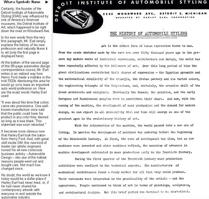 The miracle of the mid 20th century industrialized art world is directly linked to Mr. Earl's becoming America's Car Design Pioneer, and, the FBCG and the Detroit Institute of Styling (both geared to develop highly paid auto stylists, i.e., car designers, see below) were offshoots of this new business calling.