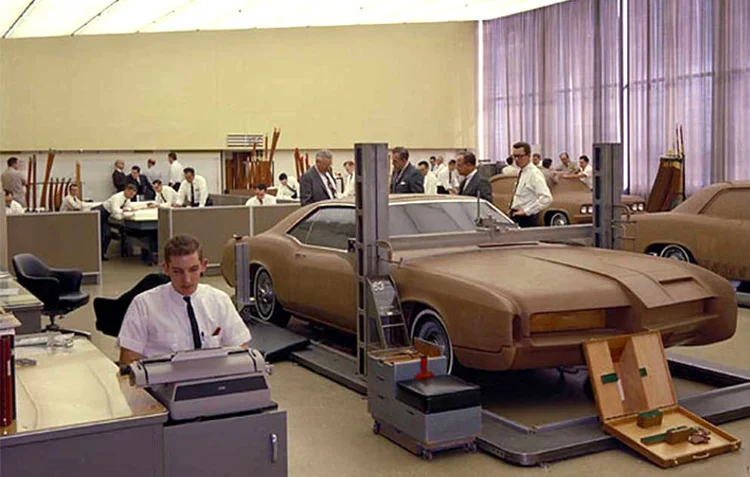 This historical GM Photographic picture demonstrates just one important facet of Harley Earl's new three dimensional world of car architecture. His 3D DNA radically went on to revolutionize the global auto building economy. Every worldwide car maker today follows this exact business pattern (pre-engineering a car or truck ahead of time) in full-size clay model mode within a state-of-the-art car design department. The Car Design operating system is afar from "low tech." The state-of-the-art design studio, above, is from 1964.
