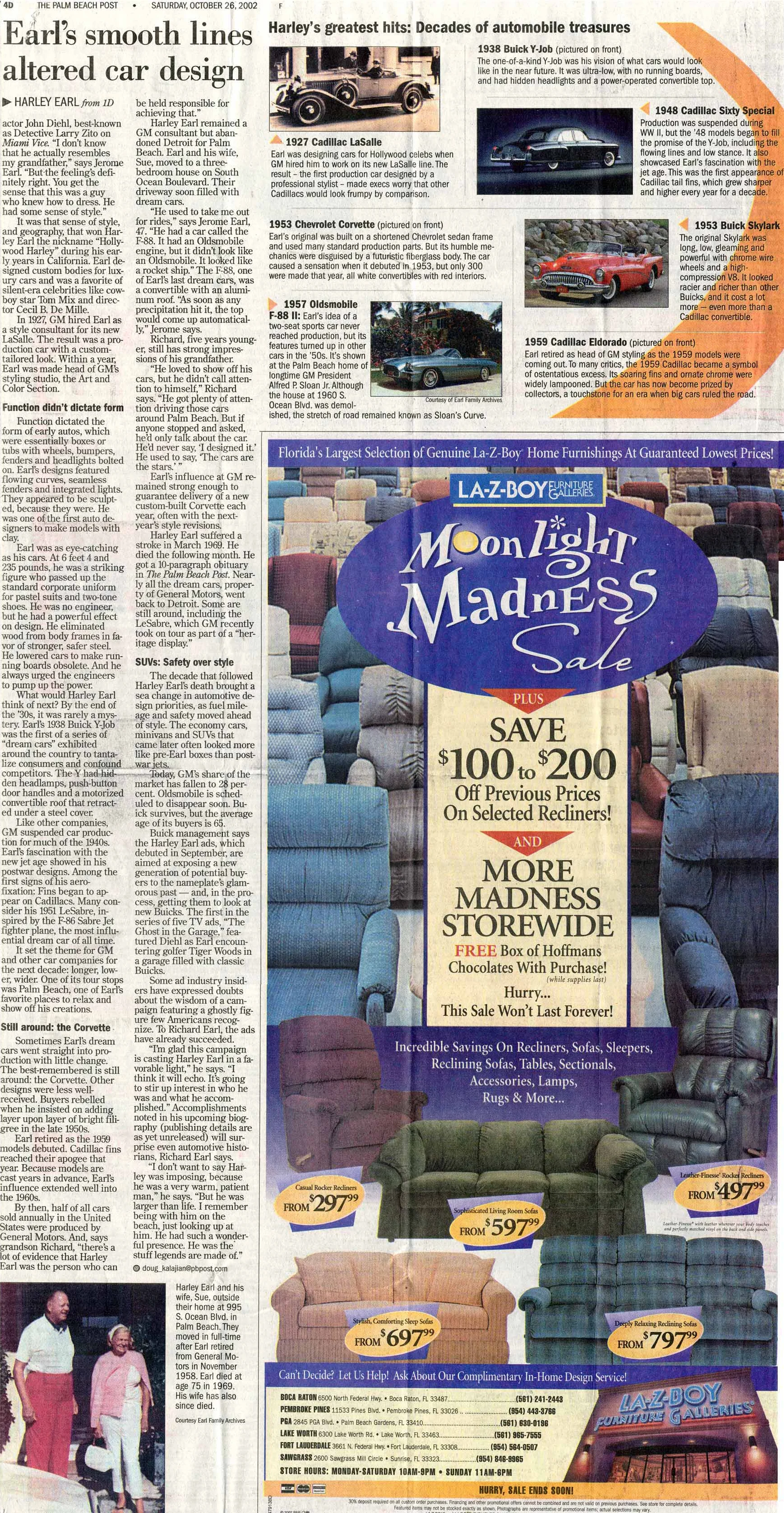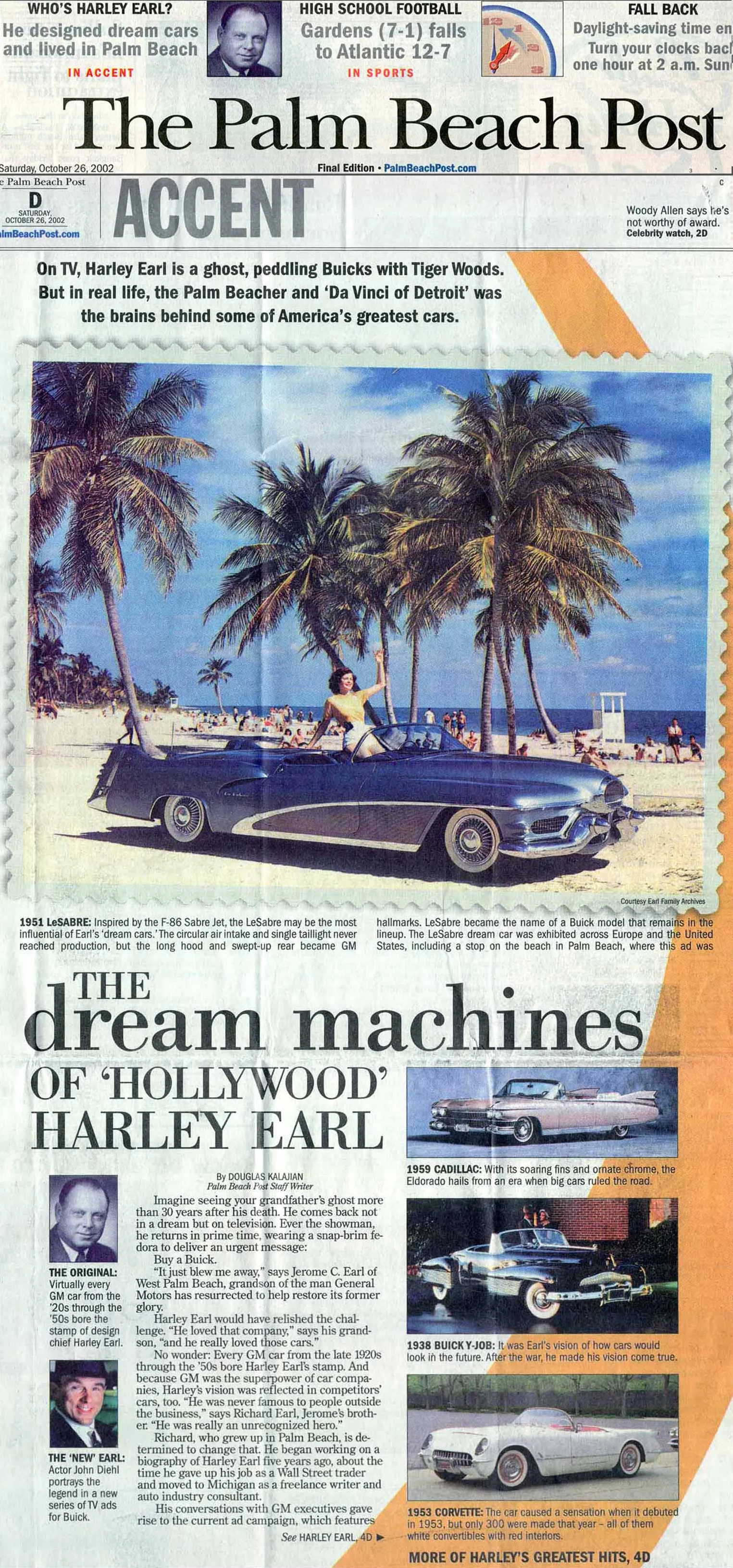 This newspaper has published numerous articles on "Who's Harley Earl" because as staff writer Douglas Kalajian confirms in a 2-pg article, directly below, this man "designed dream cars and lived in Palm Beach" and "was the brains behind some of America's greatest cars."