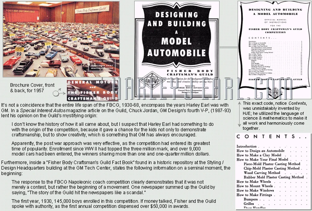 1930: The Fisher Body Craftsman's Guild (FBCG) is formed to cultivate young design talent in America. Following quote from the FBCG Fact Book of 1958 says it all: The response to the FBCG Napoleonic coach competition clearly demonstrates that it was not merely a contest, but rather the beginning of a movement. One newspaper summed up the Guild by saying, "The story of of the Guild hit the newspapers like a scandal." The first year, 1930, 145,000 boys enrolled in this competition. If money talked, Fisher and the Guild spoke with authority, as the first annual competition dispensed over $50,000 in awards. (Read Harley's reaction later in the timeline, 1968, when this art & engineering movement is disbanded by the regime of leaders following in his wake.)